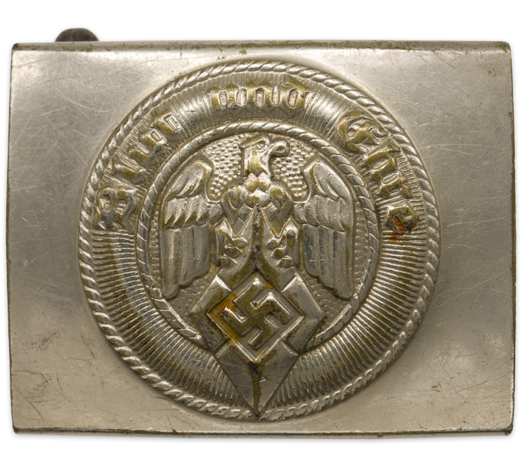 PHYSICAL DESCRIPTION: The standard, cast alloy, silver washed zinc alloy, HJ buckle, as introduced in 1933, featuring an embossed HJ eagle and diamond to its lightly pebbled center, encompassed by a dual rope-like border within which, against a ribbed background, is the embossed Gothic script, "Blut und Ehre" (Blood and Honor). Reverse of buckle with embossed RZM logo and "M4/23" for Frank & Co Lüdenscheid.