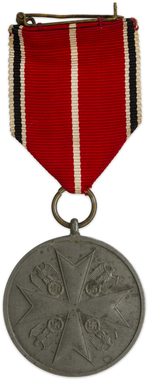 PHYSICAL DESCRIPTION: 1943 pattern. Roughly 39mm diameter, die struck zinc/alloy award. The obverse of the award features an embossed Maltese style cross with national eagles, with downs wept wings, clutching a canted, wreathed swastika, between the cross's arms on a smooth background field with a raised outer edge. The reverse has embossed script "Deutsche Verdienst-Medaille", (German Merit-Medal), on a smooth background field with a raised outer edge. Complete with original ribbon and pin back device.