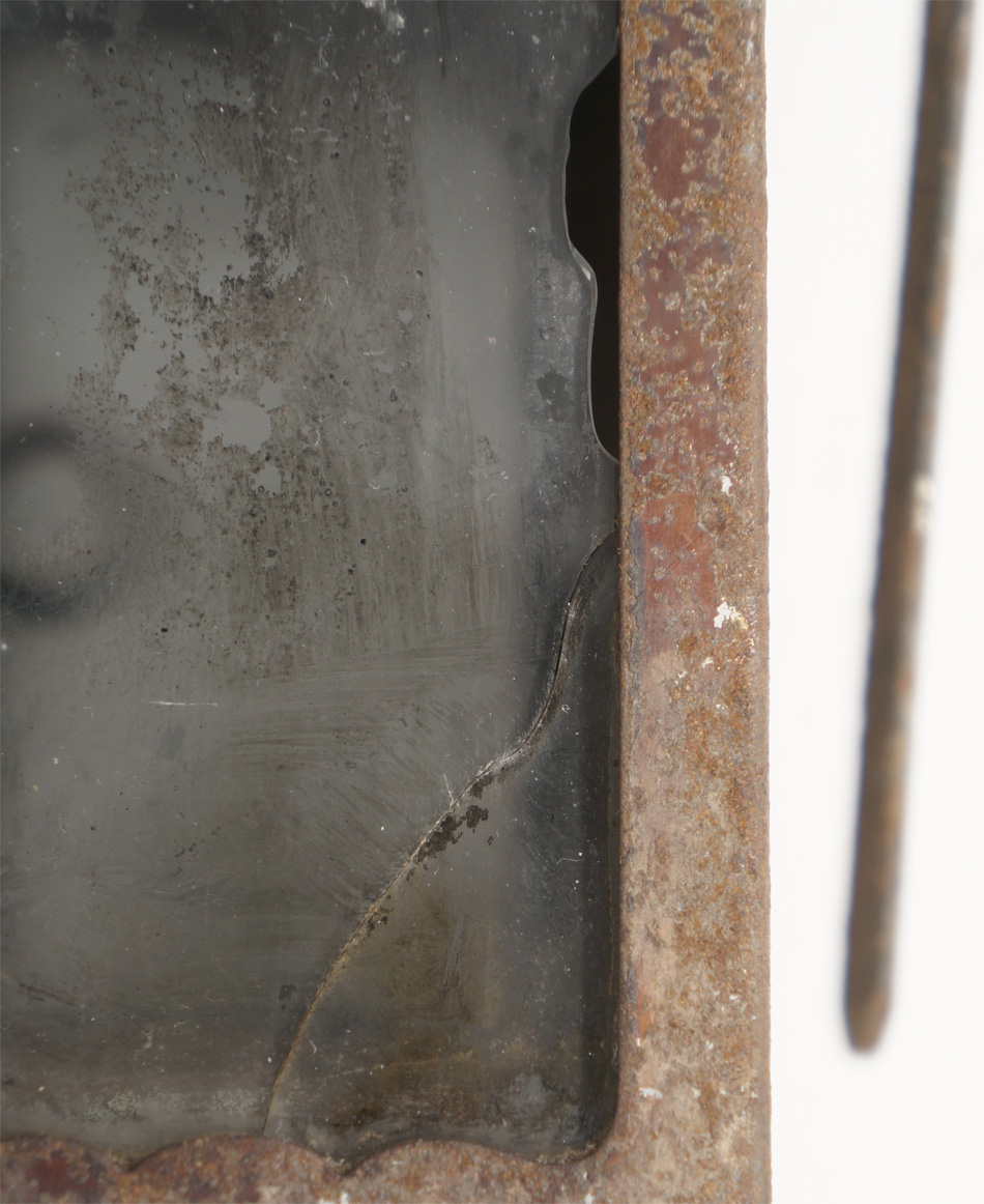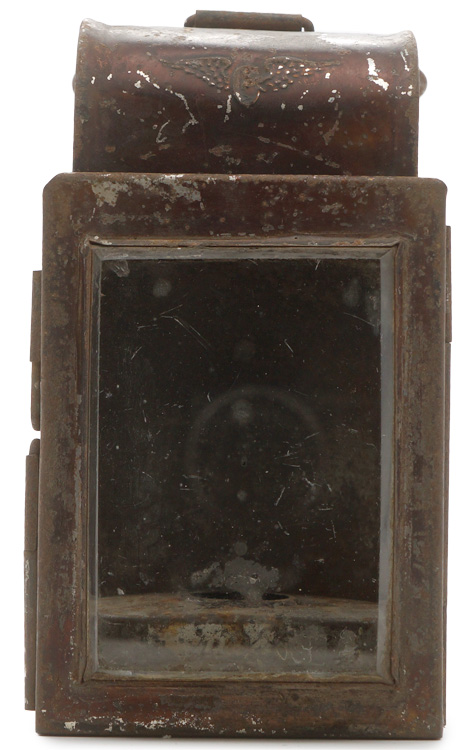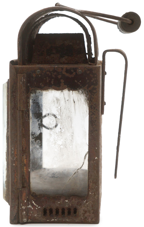 PHYSICAL DESCRIPTION: A tin lantern measuring approximately 17cm x 9.5cm x 7cm that is complete with original clear glass and original wire and wood handle. Embossed to the hood is a wheel with wings extending horizontally from either side. The lantern shows heavy usage, wear and oxidation, as well as glass wear and a crack to the right facing side panel. The tank is present, but the mirror is missing. Also present is the bent "belt hook" to the reverse panel.