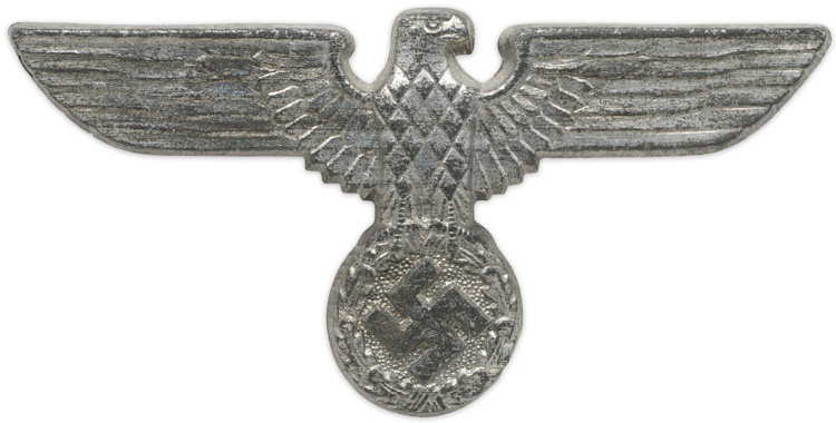 PHYSICAL DESCRIPTION: A 1939 pattern, stamped natural alloy eagle, with a wing span of 65mm, who clutches a wreathed, mobile swastika in its talons. To its hollow-backed reverse are fixed three attachment prongs. Faint makers mark to the reverse. Nice clean example..