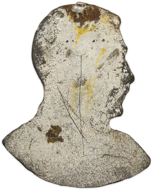 A 12.5cm x 10cm magnetic/steel, low-relief, head-and-shoulders profile portrait of, as written underneath, "Adolf Hitler." Somebody has soldiered a crude hanging device to the back. Could easily be removed.