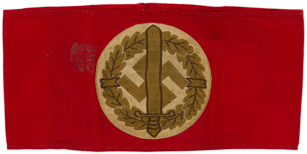PHYSICAL DESCRIPTION: The approximately 10cm x 45cm red cotton armband has a 9cm diameter white field sewn to it, upon which is the SA sports badge machine woven in copper-colored threads. The SA sports badge is in the form of an upright short sword against a mobile swastika surrounded by an oak leaf wreath. Complete with original RZM tag. Couple of small stains.