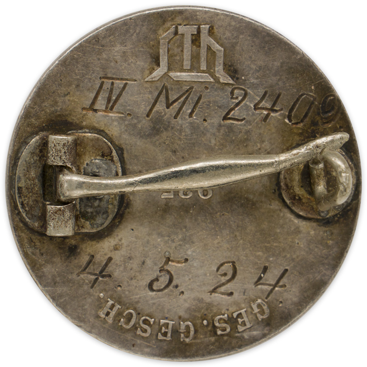 PHYSICAL DESCRIPTION: A slightly convex, 31mm diameter, nickel-silver alloy badge, against whose black enameled obverse is pinned a profiled M16 helmet, above whose chin strap rivet is stamped an Iron Cross followed by "Der Stahlhelm" in Gothic script. The recessed Iron Cross and lettering have been darkened in a way that highlight them. Beneath the helmet, the enamel breaks to form two crossed oak leaves above a "1924" date (this badge was available with consecutive dates from 1919-1932). To the reverse is a hinged, vertical pin (slightly bent) and is complete with the original catch. To the right of the pin is embossed the manufacturer’s logo of an underlined and stylized "S," "T," and "H." To the left of the pin is embossed "Ges. Gesch.," for "Gesetzlich Geschützt" (By-law Protected). Badge is "935" silver content marked.