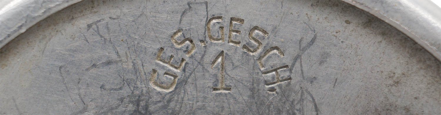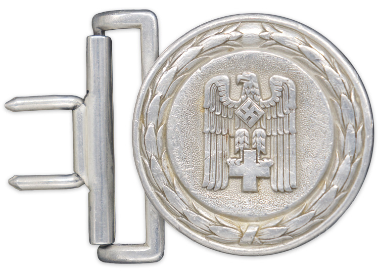 PHYSICAL DESCRIPTION: Roughly, 50mm diameter, stamped aluminum buckle with a silver wash. Face plate features an embossed second pattern DRK national eagle with down swept wings, clutching a cross in its talons with an embossed swastika to breast on a raised pebbled field. Outer edge of buckle with a slight recess with embossed, circular laurel leave wreath. Reverse with crimped outer edge and stamped out buckle catch and prong retaining clip. Reverse well marked with impressed script, "Ges. Gesch." for Gesetzlich Geschützt (Patented Pending), and manufacturers number, "1". Catch rectangular prong retaining bar and prongs all intact.