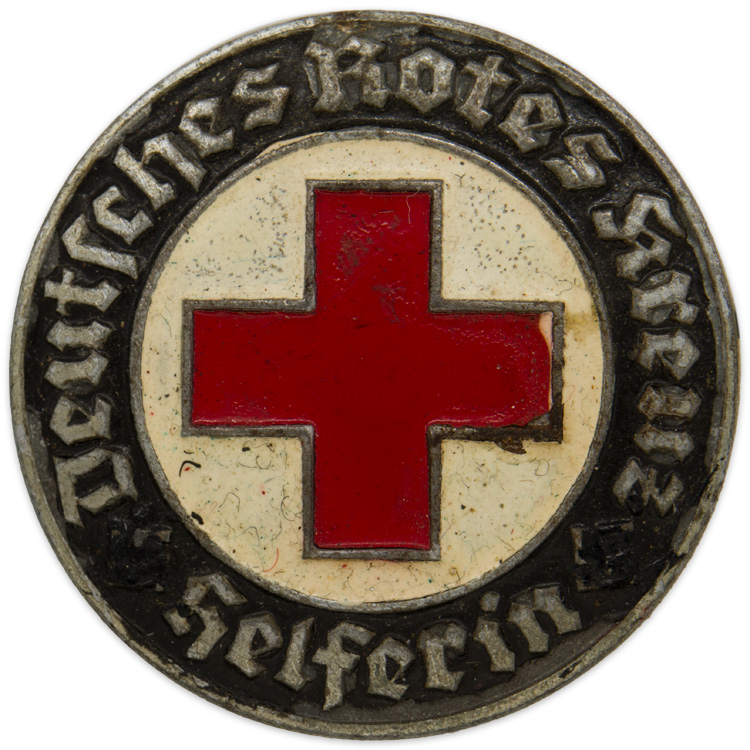 PHYSICAL DESCRIPTION: Roughly, 30mm diameter, nicely convexed, die struck alloy brooch with a silver wash and black, white and red painted finishes. The brooch features a black painted circular outer border with embossed silver washed Gothic script, "Deutsches Rotes Kreuz Helferin", (German Red Cross Helper), encompassing a white painted circular inner field with a central red painted Greek style cross. The reverse also has a small soldered hinge, a thin round horizontal pin and a soldered catch all intact.