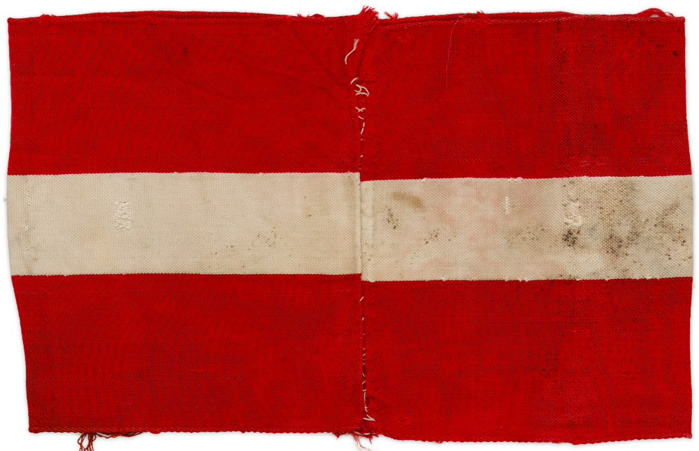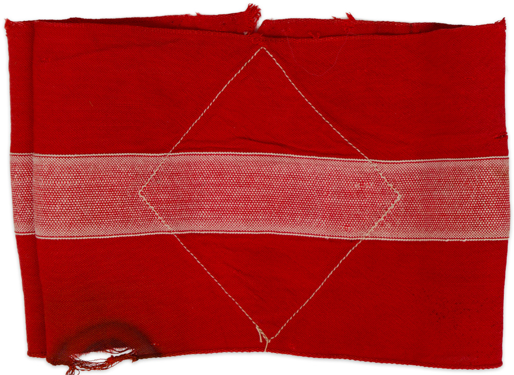 PHYSICAL DESCRIPTION: A later production, three-piece construction, red rayon armband. The armband has a central white horizontal stripe, with a white diamond and a machine woven construction black mobile swastika.