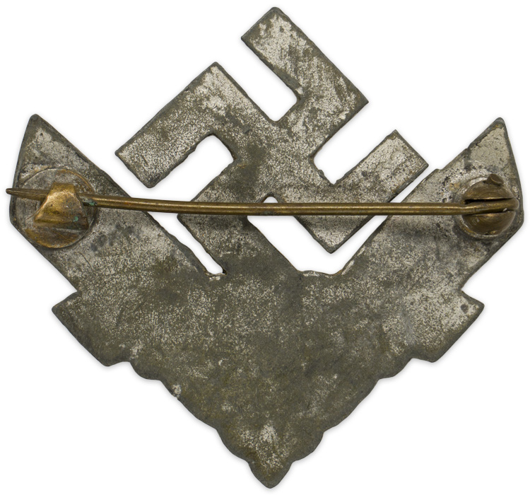 PHYSICAL DESCRIPTION: Stamped, solid backed, alloy badge, features a central canted swastika flanked by diagonally angled sheaves of wheat with a superimposed banner with embossed initials, "RADwj", to the bottom. The badge shows nice detailing including cut outs to the arms of the swastika. The reverse has a small soldered hinge a round horizontal pin and catch. The RADwJ War Helper’s Service badge was worn on the left lapel by all eligible personnel.
