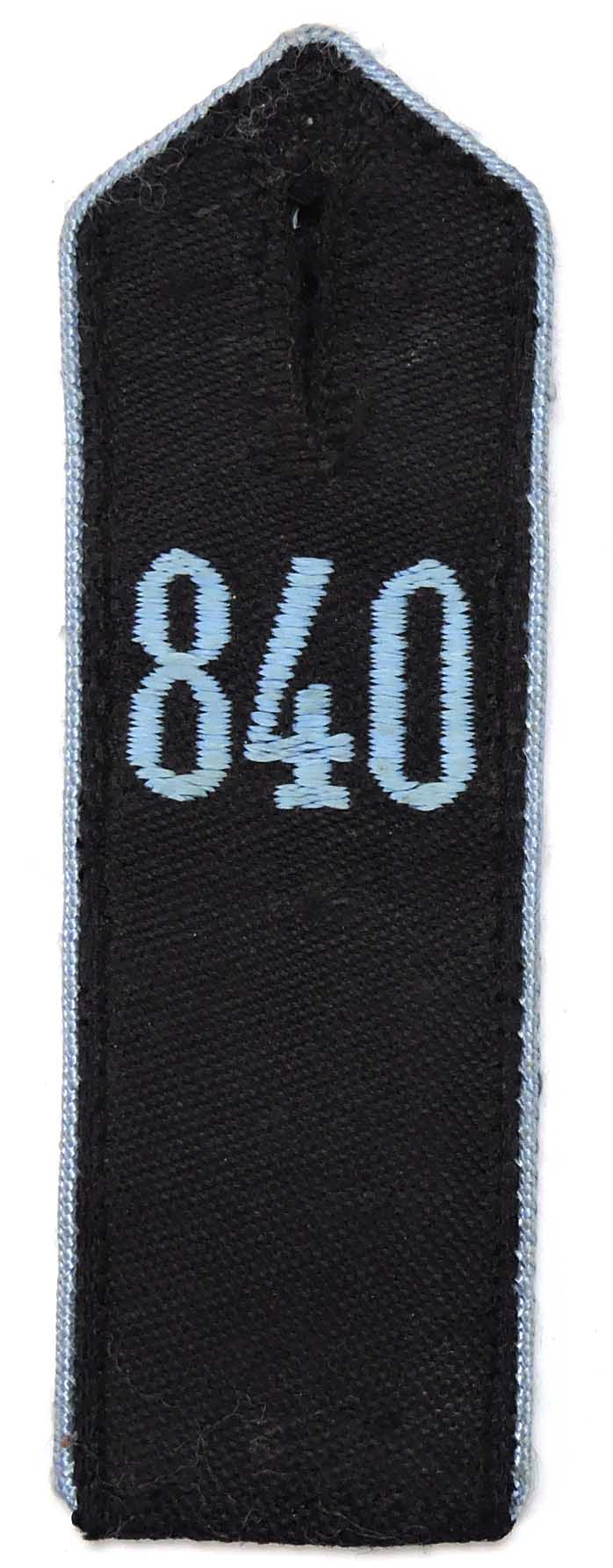 PHYSICAL DESCRIPTION: Single, 1938 pattern, black woven rayon, slip on shoulder strap with light blue rayon piping and machine woven Arabic Bann numerals, "840" also in light blue. Strap signifies rank of Hitlerjunge serving in Bann 840 of the Flieger-HJ.