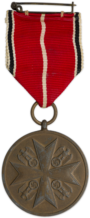 PHYSICAL DESCRIPTION: 1943 pattern. Roughly 39mm diameter, die struck bronze/tombac award. The obverse of the award features an embossed Maltese style cross with national eagles, with downs wept wings, clutching a canted, wreathed swastika, between the cross's arms on a smooth background field with a raised outer edge. The reverse has embossed script "Deutsche Verdienst Medaille", (German Merit Medal), on a smooth background field with a raised outer edge. Complete with original ribbon and pin back device.