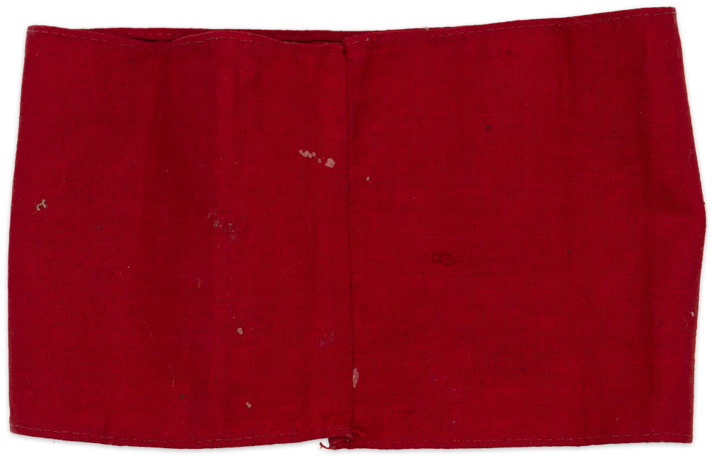 PHYSICAL DESCRIPTION: A red cotton armband, upon which is sewn an approximately 9cm diameter white disk, with a black machine woven mobile swastika. Shows the expected period use and wear but overall nice condition.