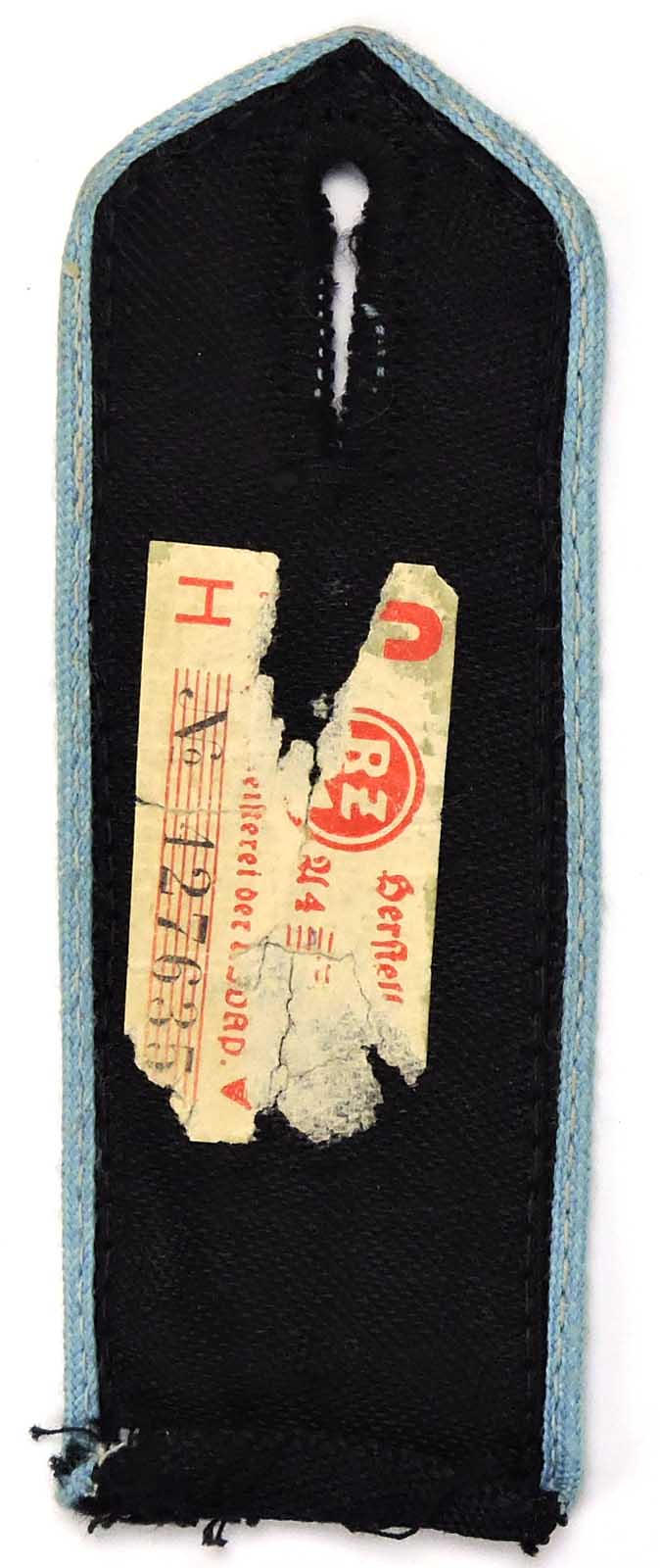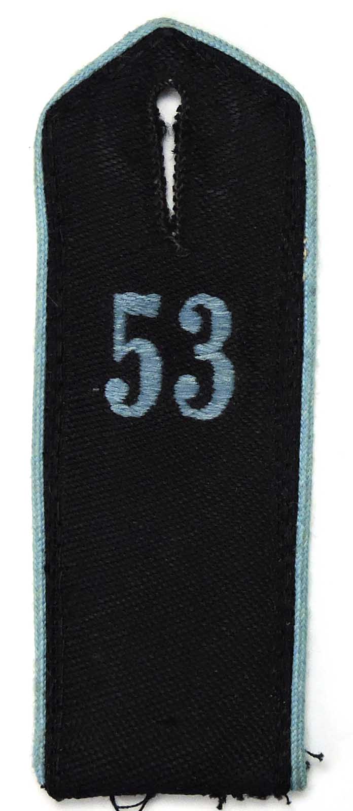 PHYSICAL DESCRIPTION: Single, 1938 pattern, black woven rayon, sew on shoulder strap with light blue rayon piping and machine woven Arabic Bann numerals, "53" also in light blue. Strap signifies rank of Hitlerjunge serving in Bann 53 of the Flieger-HJ. Partial HJ/RZM tag.