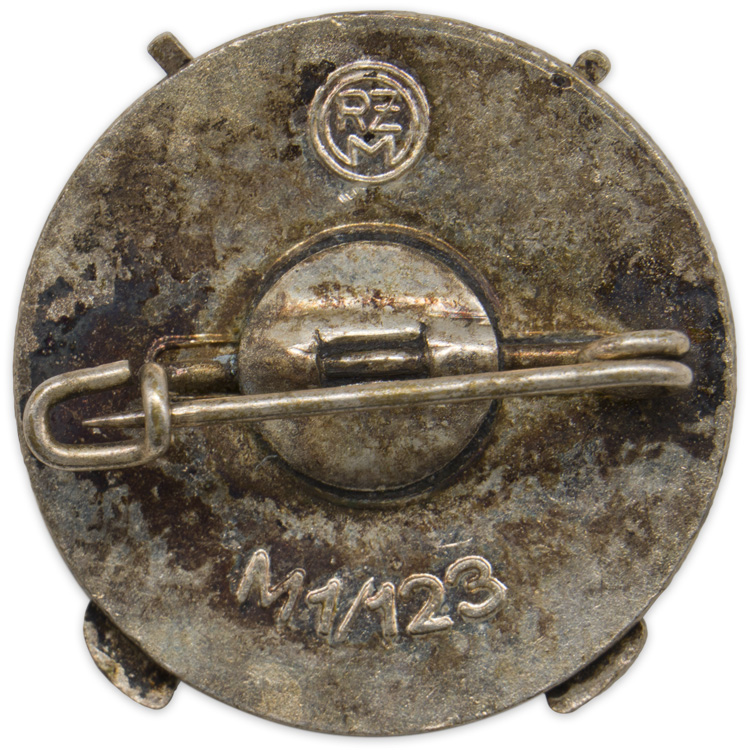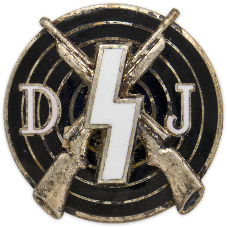 PHYSICAL DESCRIPTION: A approximately 22mm diameter, convex alloy badge, whose obverse features four concentric silver washed rings against a black enamel background, to the center of which is affixed the single DJ sigrune, with crossed, silver washed rifles behind it. The 9mm tall sigrune is in white enamel with a silver border. A horizontal pin back device is crimped to a circular plate soldered to its reverse. Above the plate is embossed an RZM, "Reichszeugmeisterei" (National material control office), logo and "M1/123", for Petz & Koch.