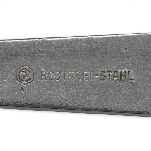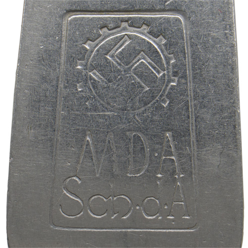 Roughly, 21cm long, one piece, stainless steel construction, mess hall fork. The reverse of the handle is well marked with very nice DAF logo and "M.D.A" & "Sch.d.A". The spoon is marked Rostfrei Stahl".