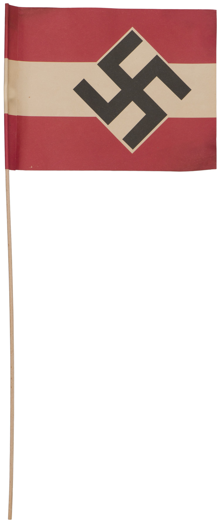 PHYSICAL DESCRIPTION: Printed paper construction flag, 17cm x 14cm red field with a central, horizontal white band against the center of which is a square white diamond with black printed mobile swastika. Original wooden stick is present. Typically give out at rallies and parades.