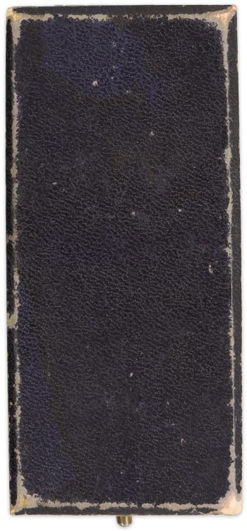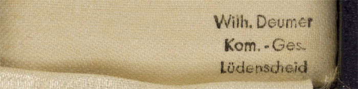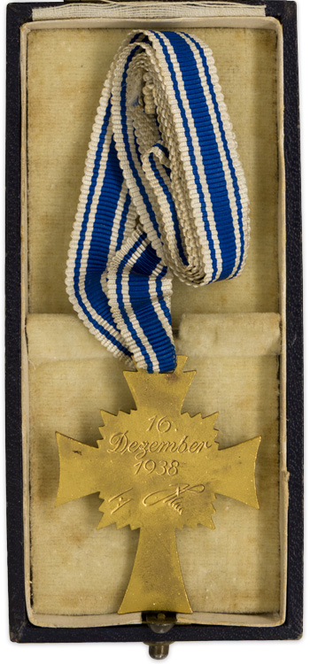 PHYSICAL DESCRIPTION: A second pattern, two piece, die stamped tombak award with a fire gilted finish and blue and white enamel work. The award is in the form of a Christian cross in blue enamel with a white enamel border, both outlined in gold. Between each arm of the cross are five-ray projections in gold. The central circular field has a white enamel base upon which is a black static swastika, outlined in gold, and encompassed by a gold surround with the embossed Latin script, "Der Deutschen Mutter" (The German Mother). The reverse has the stamped simulated handwritten script, "16 Dezember 1938," and a facsimile of Hitler’s signature. It comes with it original ribbed rayon blue and white striped ribbon.