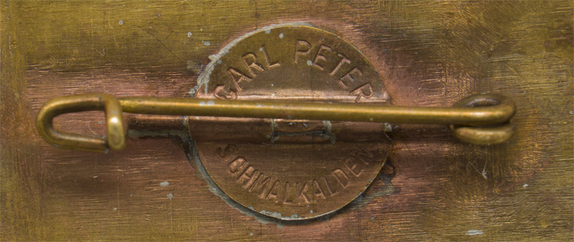 An approximately 50mm x 25mm, die cast alloy badge. The badge depicts an SA insignia above a castle scene. The bottom of the badge contains the embossed text, "Brigade 43 Meiningen 10. Juni. 1934.". Complete with pinback device and makers marked, "Carl Peter Schmalkalden".