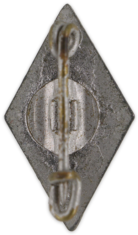 PHYSICAL DESCRIPTION: A cast alloy lapel pin, in the form of an elongated diamond, 23mm tall and 15mm wide, within which is a mobile swastika. Red, black and white paint work is all complete. A vertical pin-back device is to its reverse. Embossed RZM logo, and "M1/?,".is embossed near its other end. Nice example.