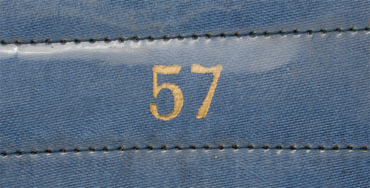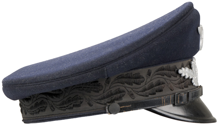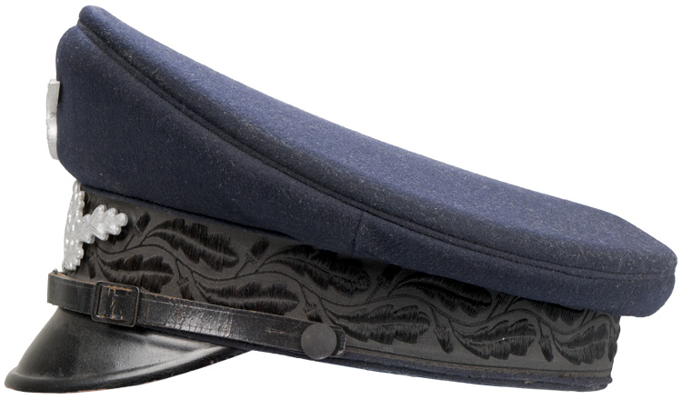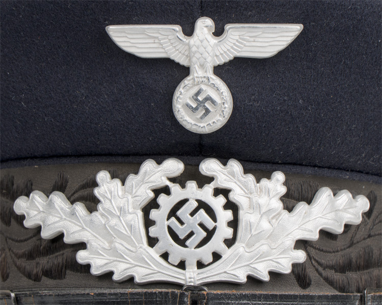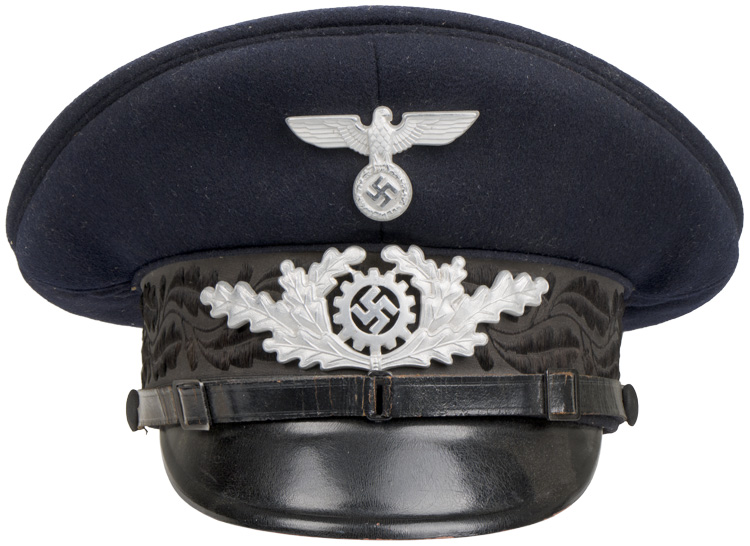 PHYSICAL DESCRIPTION: A very quality 1938 pattern, issued, dark blue colored wool construction visor cap. The cap features a one piece circular crown, piped in blue/black, a body with seams to each of its cardinal points, a one piece, blue/black center band, also piped in blue/black along its upper and lower edges and whose vertical seam is to the reverse, and a black vulcanfiber visor. The center bank has an embroidered pattern of Oakleaves around its entire circumference. The interior crown wire and front vertical stiffeners are intact. Fixed over the forward seam line of the body is a slightly convex, silver colored, stamped alloy eagle, 1 1/4" in overall height and with a wing span of 2 1/2", which clutches a wreathed, mobile swastika in its talons. Beneath it, affixed to the front and following the contours of the center band, aluminum wreath of Oakleaves with the DAF emblem to its center. The black leather chinstrap is affixed by two cloth covered chinstrap buttons. The black vulcanfibre visor has a protective lacquered finish to its upper surface. To the interior of the cap is a red/brown colored leather sweatband and a dark blue colored rayon lining. Original celluloid shield is complete. Shield is size marked "57". Very nice complete oilcloth DAF/RZM tag is sewn to the interior centerband. With the combination of the black chinstrap and the silver insignia, the cap would be for the ranks of Werkscharmann to Rottenführer. Superb, untouched original example. Quite scarce.