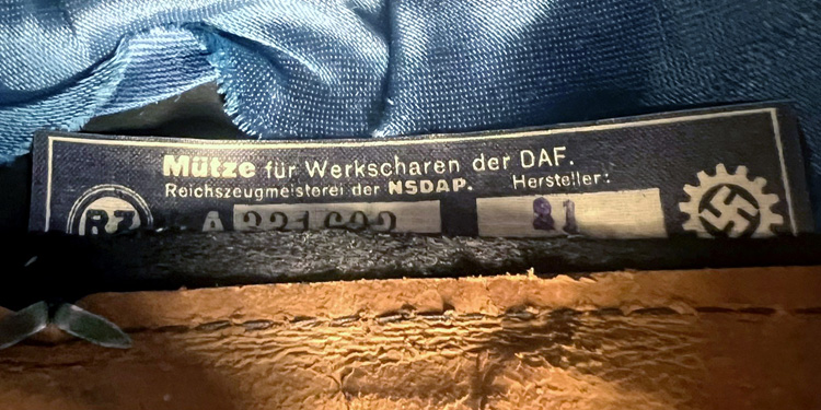 BACKGROUND: The Deutsche Arbeitsfront, (German Labor Front), originally founded in 1933, became an official NSDAP organization in October 1934. Its stated purpose was to educate the workers in industry and commerce for smooth and efficient operation of all labor in the Third Reich. The structure of the DAF was basically the same as the NSDAP with different political levels of organization. Due to the diversification in labor the DAF was divided into sub sections for specific trades and/or professions and it also controlled the Kdf, Kraft durch Freude, (Strength through Joy), organization which provided recreation for workers. However the DAF’s most important goal was to enforce the political stability of the large mass of the work force. One of the sub sections of the DAF was the DAF Werkscharen, (DAF Labor Squads). The Werkscharen were established in February 1935 and were to act as the NSDAP’s "watch dog", in industrial factories. In June 1935 the Werkscharen were granted independent status and uniform regulations were enacted. In November 1935 the first pattern Werkscharen overseas cap was introduced. In April 1937 with a reorganization of the Werkscharen a second pattern overseas cap was introduced and the first pattern cap was discontinued. In October of 1938 visor caps where authorized for wear on ceremonial occasions, but never to be worn in the work place.