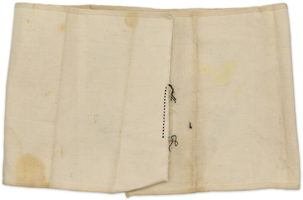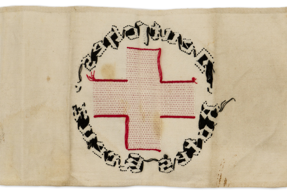 PHYSICAL DESCRIPTION: White cotton/rayon armband, upon which is machine woven a red Balkan cross, with "Deutsches Rotes Kreuz" scrolled around it in black Gothic script.