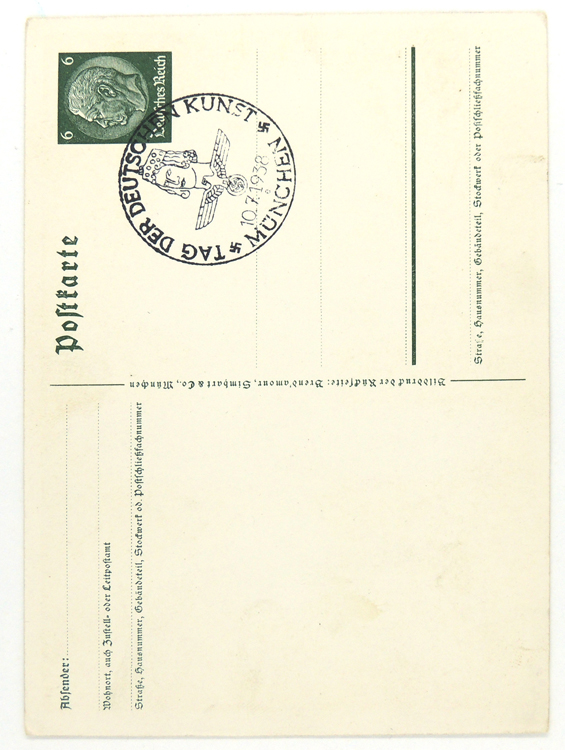 A 1938 official postcard commemorating the "Day of German Art". The postcard has been posted with a cancellation stamp for 1938 Munich. Measures approximately 10.5cm x 15cm.