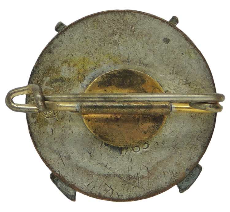 PHYSICAL DESCRIPTION: A approximately 22mm diameter, convex alloy badge, whose obverse features four concentric silver-washed rings against a black enamel background, to the center of which is affixed the single DJ sigrune, with crossed, silver-washed rifles behind it. The 9mm tall sigrune is in white enamel with a few small chips. A horizontal pin-back device is crimped to a circular plate soldered to its reverse. RZM mark, partially under the backing plate.