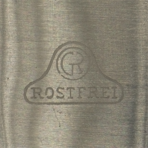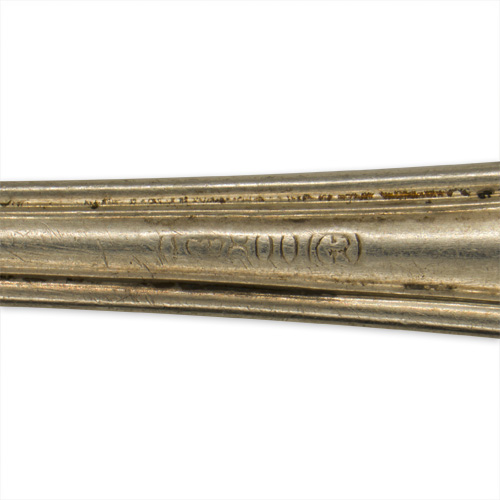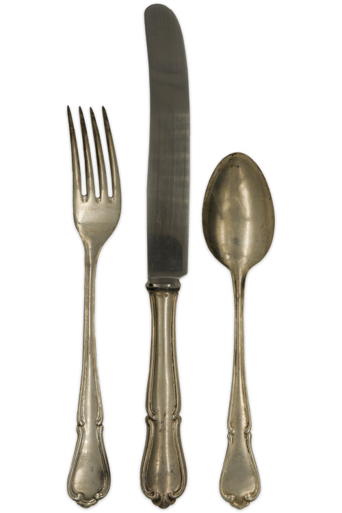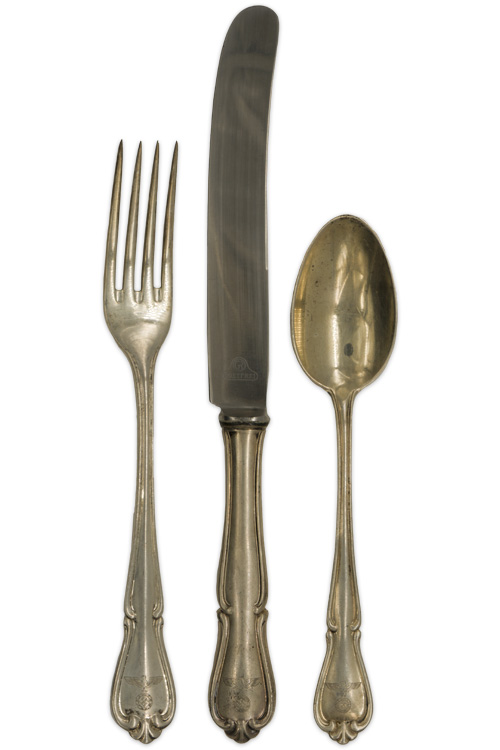 A setting consisting of a teaspoon, fork and table knife with the same pattern handles and engraved designs. The silver, one piece spoon and fork are both marked with a silver content of "800" as well as manufacture marked for Gebrüder Reiner (Brumbach Bayern). The two piece table knife has a silver handle marked "800", with a stainless steel blade that is marked "Rostfrei".