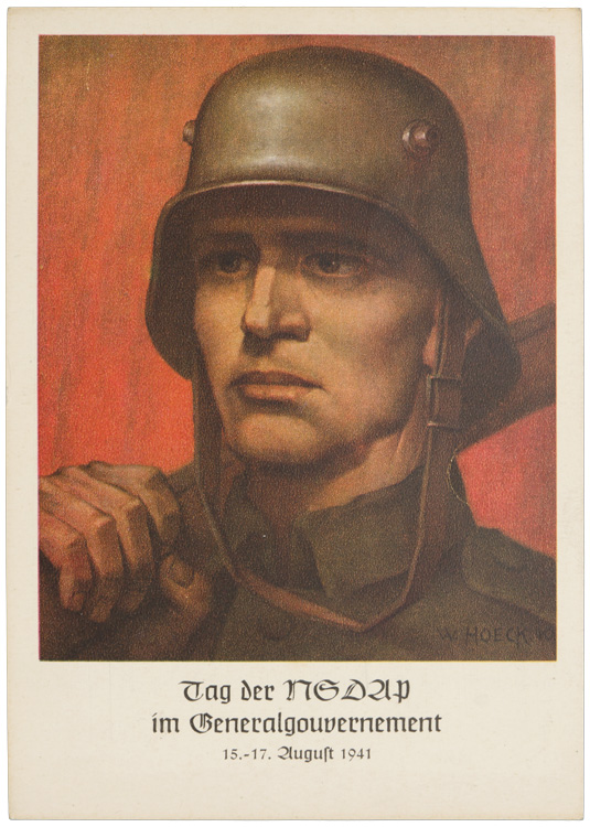 A standard size postcard with a full colour reproduction of a painting of a soldier wearing an M16 pattern helmet. Underneath this image is printed "Tag Der NSDAP Des Generalgouvernement 15. 17. August 1941". To the reverse is a purple stamp entitled "Generalgouvernement" with an eagle and swastika to its upper left corner.