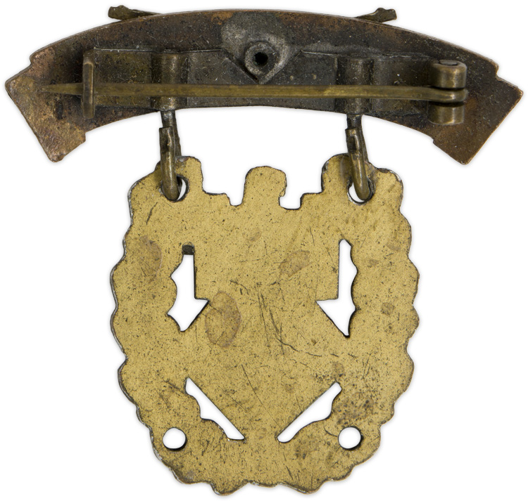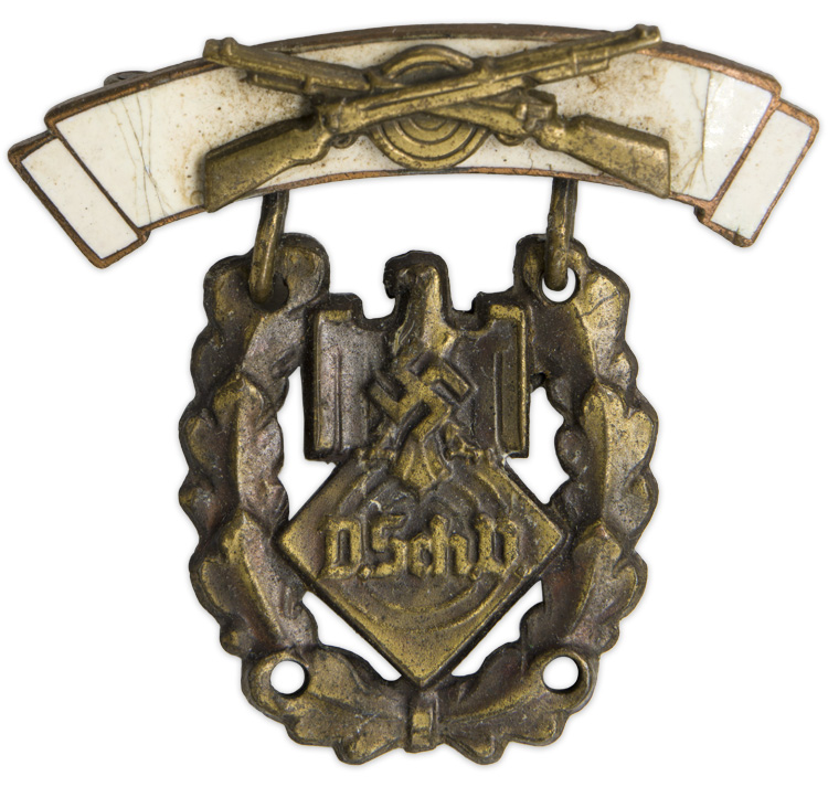 A solid, stamped alloy badge with a gilt wash. The award, which is roughly in the form of a vertical oval, features an open topped oak leaf wreath surrounding a stylized eagle with a mobile swastika to its breast, beneath which is a square on its point with concentric circles to it and "D. Sch. V." (For "Deutsche Schutzen Verband") embossed across it. Original pin back hanger with crossed rifles attached.