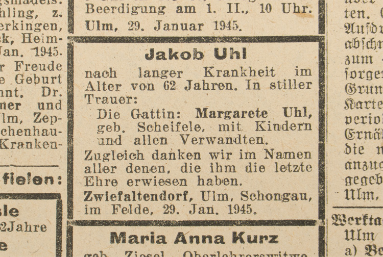 A 14cm x 36cm posted envelope, along with three typewritten and signed "Sterbeurkunde" or Death Certificates that are dated for "29. Januar 1945". Included is a page from a newspaper dated for "Diensteg, 30. Januar 1945" that has a death notice for the same person.