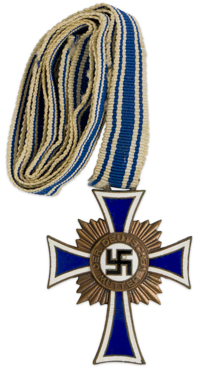 BACKGROUND: The Mother’s Cross was introduced by Adolf Hitler on December 16TH 1938 as part of a large propaganda campaign aimed at increasing the birth rate. The award was officially designated, Honor Cross of the German Mother, and was instituted in three grades to recognize and reward child bearing German females. The three grades consisted of the bronze cross for bearing four or five children, the silver cross for bearing six or seven children and the gold cross for bearing eight or more children. Criteria for the award included that the parents be of pure German blood, and that the mother was worthy of such an honor. On its introduction the cross had the impressed inscription to reverse, "Das kind adelt die Mutter", (The child ennobles the mother), but this was inexplicably changed sometime in 1939. Bestowal of the cross was accompanied by an award certificate, a cash incentive for each child born and a miniature cross for everyday wear, with the actual cross being reserved for formal or ceremonial occasions. Of Note: Members of all youth organizations were required to salute wearers of the Mother’s Cross.