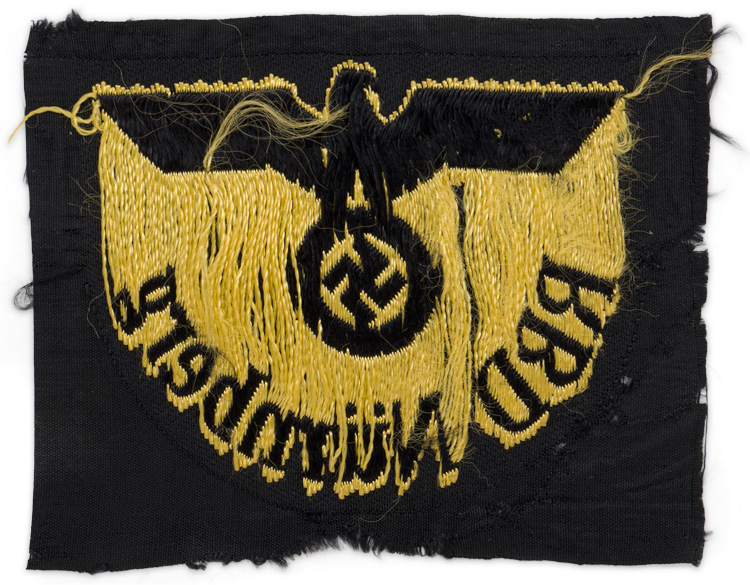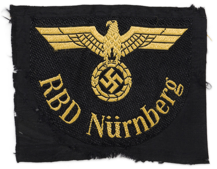 PHYSICAL DESCRIPTION: A machine woven, right facing eagle with outstretched wings and a wreathed, mobile swastika in its talons, positioned above the arching script, "RBD Nürnberg." All of the threads are bright golden yellow, against a half moon shaped, woven black base, which is still on its section of black rayon factory roll. The insignia indicates service with the "Nürnberg" division of the "Reichsbahndirektion."