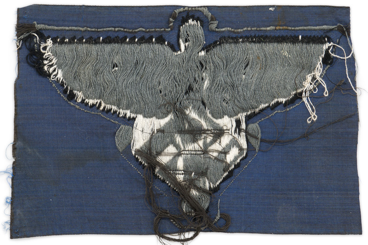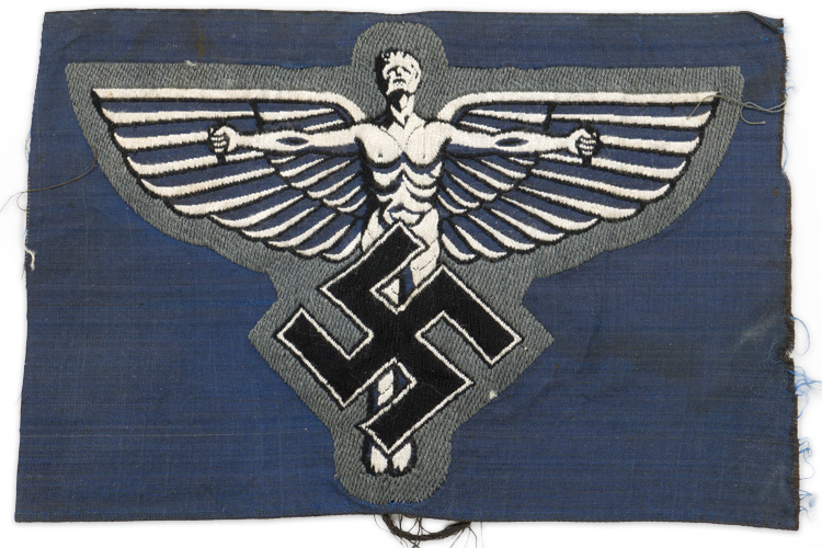 NSFK emblem of a white machine woven winged man in flight, (Icarus), with black accent threads and a white bordered black swastika superimposed on his legs. Still on its factory roll backing. Good originals like this one are very hard to find.