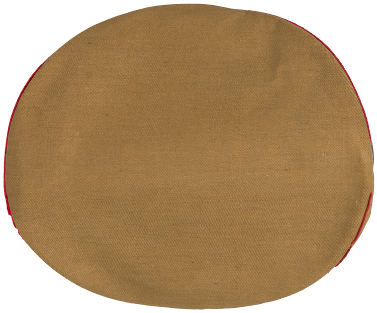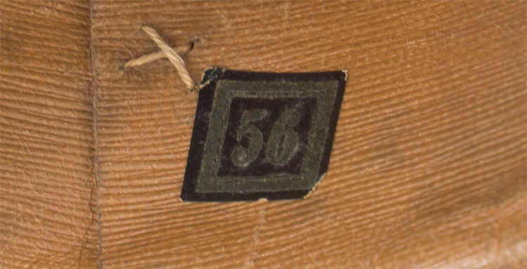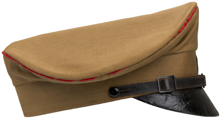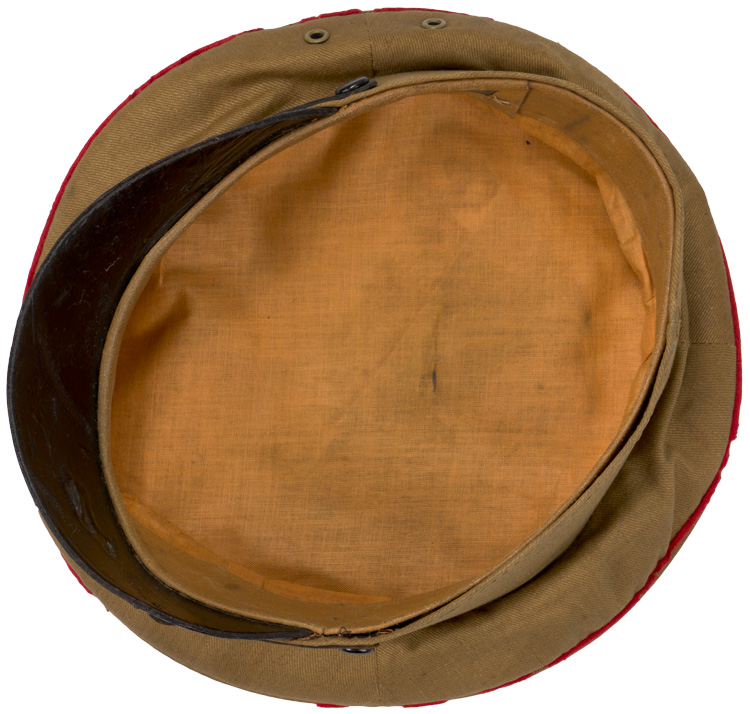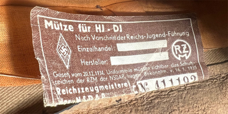 PHYSICAL DESCRIPTION: A light weight, ribbed tan cotton twill construction visor cap. The cap features a one piece circular crown, piped in red (some mothing), with a body with seams to each of its cardinal points, a one piece centerband whose vertical seam is to the back, and a leather visor. Eagle is missing, but would be an easy fix. Attached to the centerband is an enameled HJ badge. Fixed by the black painted, convex metal buttons positioned over each ear is a black leather chin strap. The interior of the cap is fully lined in copper colored cotton, and features a wide leather sweatband. Cap is size marked 56. Nice original RZM tag. Very nice, worn and used, untouched cap. Scarce to see with the leather visor.