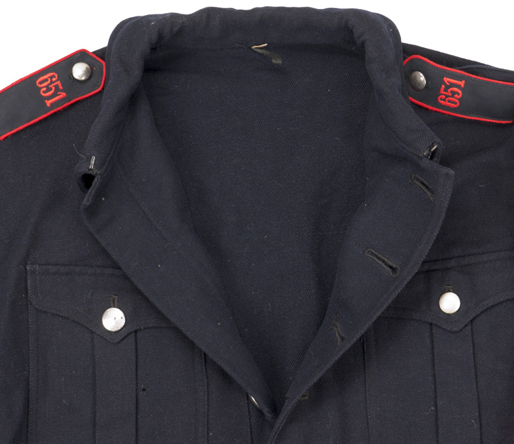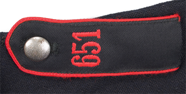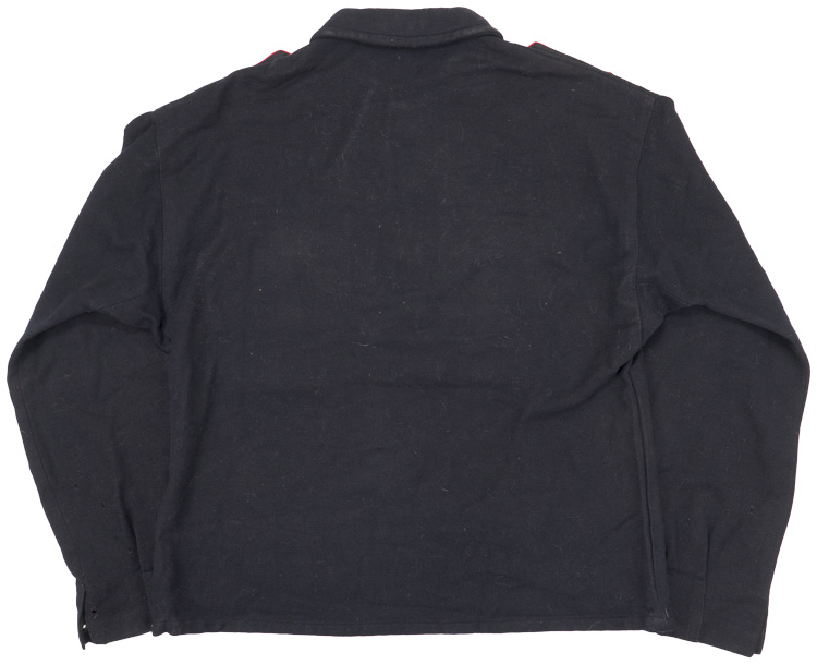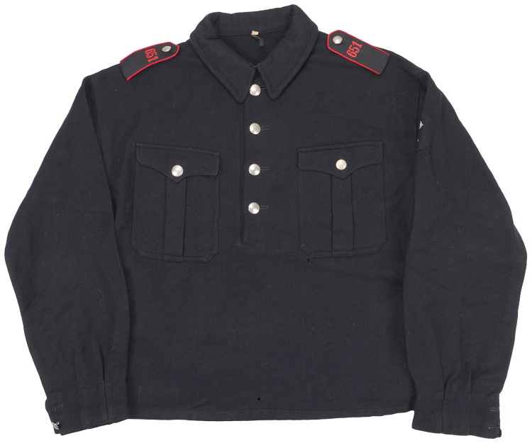 PHYSICAL DESCRIPTION: Coarsely woven, heavy navy blue wool/rayon blend, winter pullover shirt. Shirt features a four button front vertical closure plaquet with single metal hook and eye at neck. Shirt has two pleated patch breast pockets with scalloped button down flaps. All the buttons are the silver washed pebbled sheet metal type. Three of the four cuff buttons are missing and will need to be restored. Comes with a nice original pair of slip on shoulder straps. DJ Jungzugführer badge is hand sewn to the left sleeve. Unlined interior. Shirt roughly size 38" chest. Shirt was worn over the standard brown shirt and tucked into the winter pants. Faded oilcloth HJ/RZM tag is sewn to the inside front waist. Nice worn example that was used.