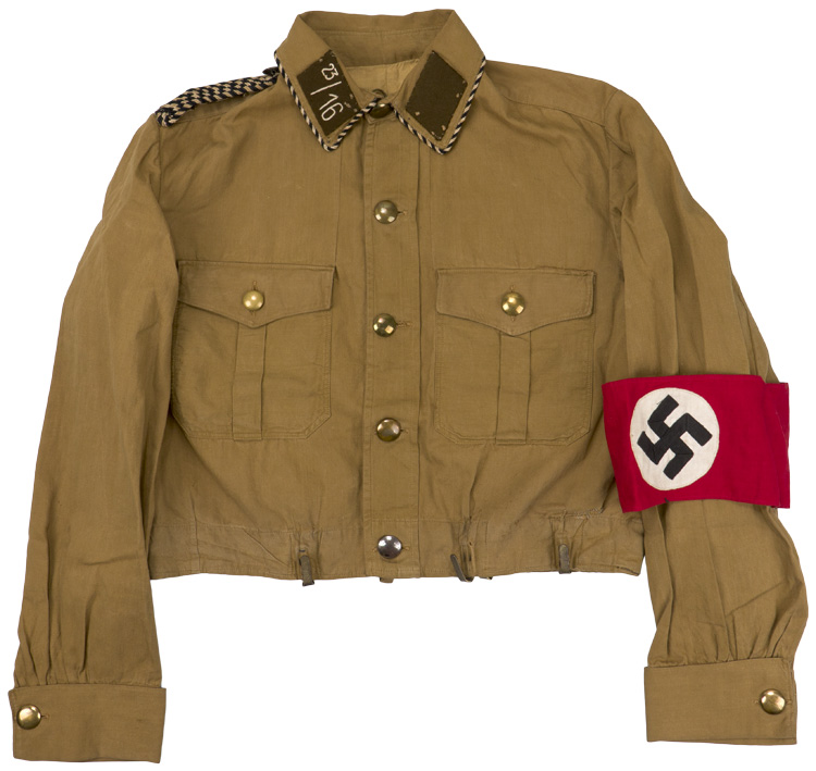BACKGROUND: Brown was to become the official color of the N.S.D.A.P. and S.A. by circumstance rather than design. A large stockpile of discounted, surplus WWI tropical brown shirts and fabric, intended for wear in East Africa, were located in Austria in 1924 and purchased by the Nazis as a temporary measure to bring uniformity of dress to their party members. In November of 1926 the brown shirt was officially introduced, and retained, as the basic uniform item for the N.S.D.A.P. and S.A., and was eventually adopted by other political organizations such as the H.J., D.A.F., and the N.S.K.K.