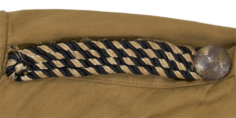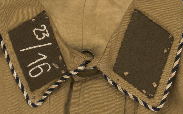 PHYSICAL DESCRIPTION: The numerals signify the wearer was attached to the "23RD Sturm" (Company) of the "16" is the "Standarte" (Regiment). The coloration indicates that the individual was a member of SA Gruppe Niedersachsen. All insignia is hand applied, which is typical on these. Some mothing to the brown wool. Light tan cotton twill construction shirt with a five button front closure. Shirt features two pleated, patch, breast pockets with scalloped flaps. The two pocker buttons are different sizes, so at least one has been repaired at some point. Sleeves have five tapering darts and fold back French cuffs with dual removable button closure. Darted horizontal waistband with six hand stitched in, pebbled steel, belt support hooks and single cotton belt loop to reverse center. The chest measures approximately 38". Well worn and used example.