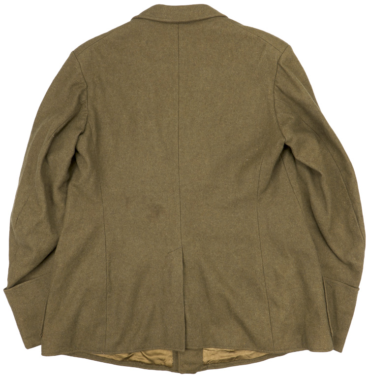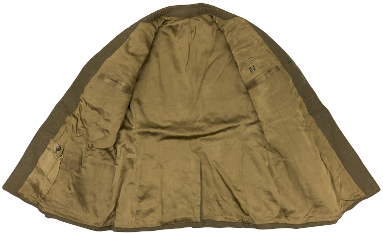PHYSICAL DESCRIPTION: An olive drab colored wool service tunic. Four button, single breasted front closure leads to a lay down collar and lapels. Four pocket front.