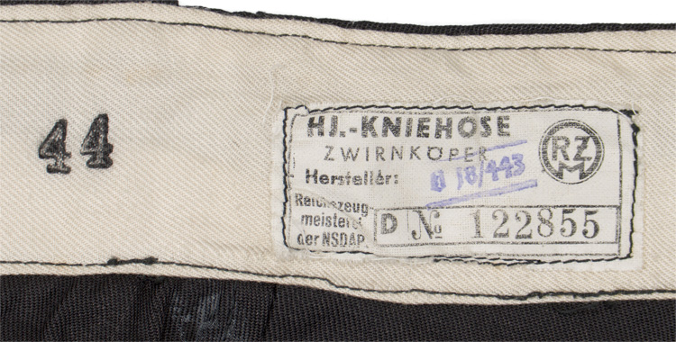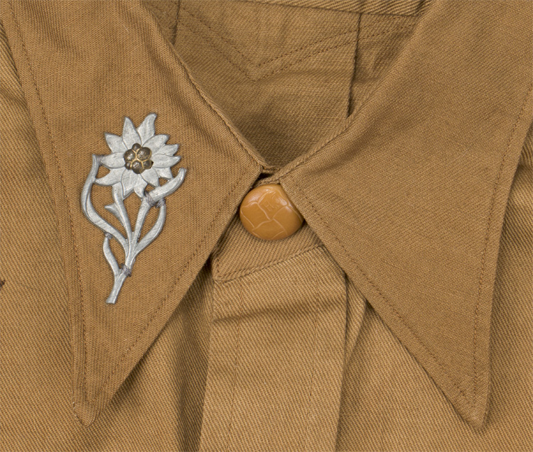 PHYSICAL DESCRIPTION: Tan colored cotton twill, long sleeved, three quarter length pull over shirt with a three button front with a lay down collar. A pleated patch pocket with a scalloped button down flap, is to each breast, as well as, fold back, pleated French cuffs. The buttons to the cuffs, pockets and front closure are all of light brown bakelite type. All of the insignia, Sleeve diamond, shoulder straps (sewn on), armband and edelweiss are all original but most probably collector restored to the shirt. The chest measures approximately 46". Few small stains. Comes with a textbook original pair of HJ shorts with their original HJ RZM tag. Shorts are a 30/32".