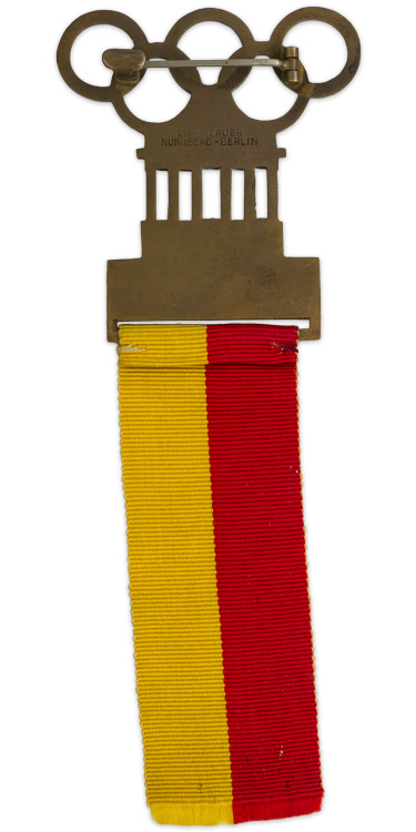 Press ribbon issued for the 1936 Berlin Summer Olympics, bronze, 43 mm x 114 mm, manufactured by Lauer, featuring the Olympics rings over the Brandenburg Gate. The front is engraved 'XI Olympiade Berlin 1936, Presse' With original red and yellow ribbon.
