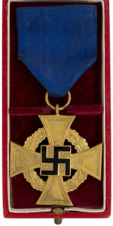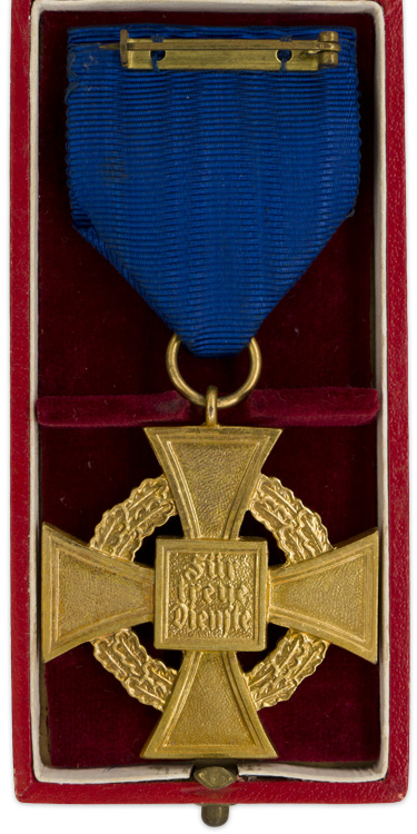 PHYSICAL DESCRIPTION: Die struck alloy, first class award with a fire gilt finish and black enamel work. The decoration is in the form of a cross Pattée with an embossed circular oak-leaf wreath extending between the arms of the cross. The center of the cross has a square plate with a black enameled static swastika to the obverse and embossed Gothic script to the reverse, "Für treue Dienste", (For Loyal Service). The arms of the cross have a slightly textured background field with smooth, dual stepped, raised outer edges. The fire gilt finish and the black enamel are both fully intact and the decoration is still very bright and clean. The ribbon suspension ring and loop are both intact. The decoration comes complete with an original piece of ribbed, moiré, cornflower blue ribbon with a brass pin back device handstitched to the reverse top edge. Also included is the original award case.
