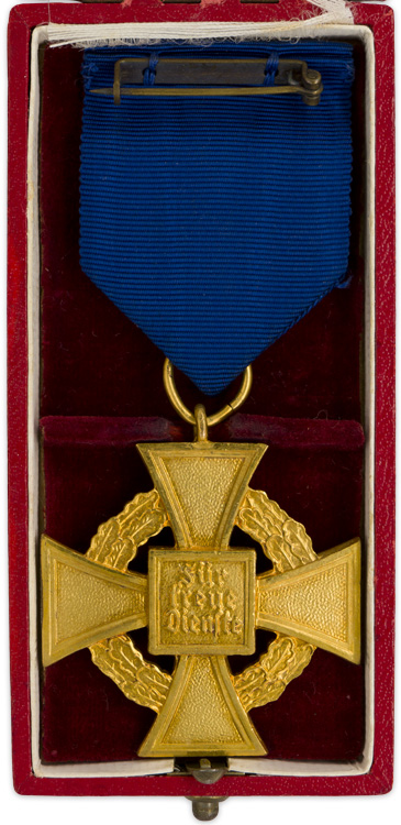 PHYSICAL DESCRIPTION: Die struck alloy, first class award with a fire gilt finish and black enamel work. The decoration is in the form of a cross Pattée with an embossed circular oak-leaf wreath extending between the arms of the cross. The center of the cross has a square plate with a black enameled static swastika to the obverse and embossed Gothic script to the reverse, "Für treue Dienste", (For Loyal Service). The arms of the cross have a slightly textured background field with smooth, dual stepped, raised outer edges. The fire gilt finish and the black enamel are both fully intact and the decoration is still very bright and clean. The ribbon suspension ring and loop are both intact. The decoration comes complete with an original piece of ribbed, moiré, cornflower blue ribbon with a brass pin back device handstitched to the reverse top edge. Also included is the original award case.