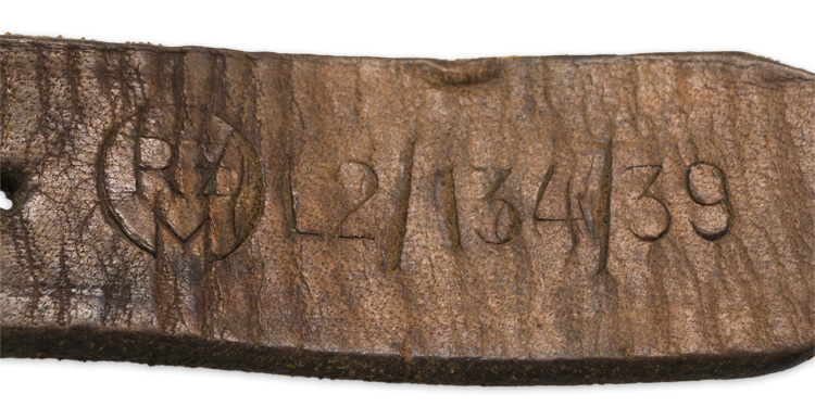 Roughly, 58cm long, 18mm wide, leather construction strap with a steel, pronged, roller buckle and leather retaining loop to one end and corresponding buckling holes to the other end. Extra hole punched in the strap by the original owner. Excellent RZM markings.