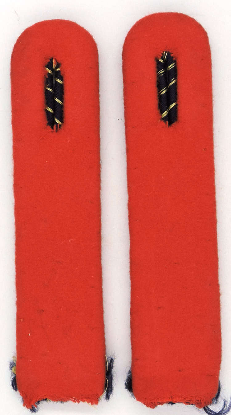 PHYSICAL DESCRIPTION: Sew on shoulder boards of navy blue Russian braid with evenly spaced golden yellow "V"s, on a red wool base.