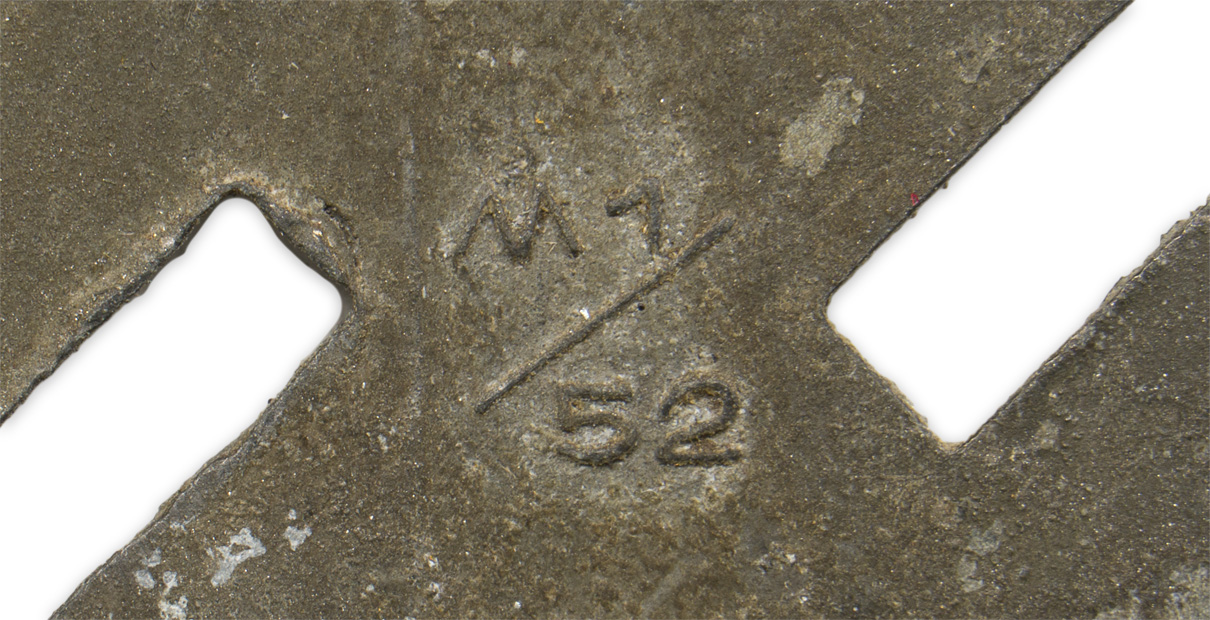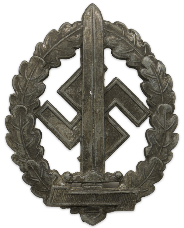 PHYSICAL DESCRIPTION: Die struck, solid backed, zinc/alloy award with a bronze wash. Badge is in the form of a slightly vertical, oval oak-leaf wreath encompassing an upward pointing broad sword with a horizontal wolfsangle on its grip, which is superimposed on a central, canted swastika. Detailing includes veins to the oak-leaves, horizontal ribbing to the sword grip, vertical ribbing to the wolfangle, raised lip to outside edges of the swastika arms and cut-outs to the interior of the wreath and swastika arms. Complete with original hinge, pin and catch assembly (Catch is pushed in, in the closed position). Reverse is well marked with embossed RZM manufactures code, "M1/52" indicating manufacture by Deschler & Sohn München.