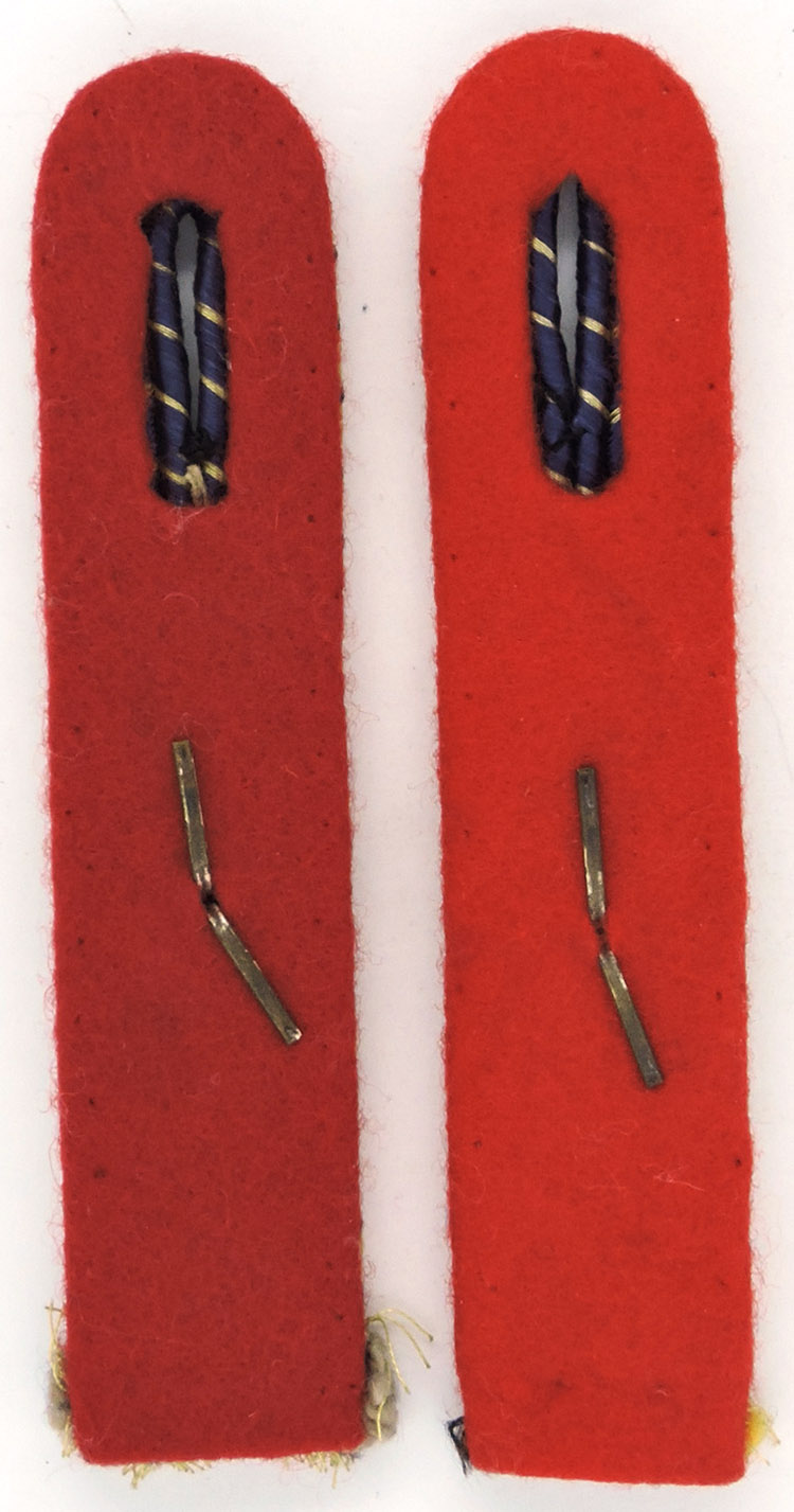 PHYSICAL DESCRIPTION: Sewn on shoulder boards. Underlay in red wool, and doubled cords to their surfaces, the outermost in gold with navy blue chevrons, and that to the inside in navy blue with gold chevrons. 1942 Pattern pips.