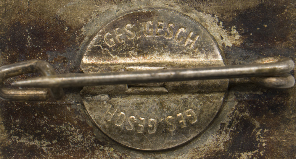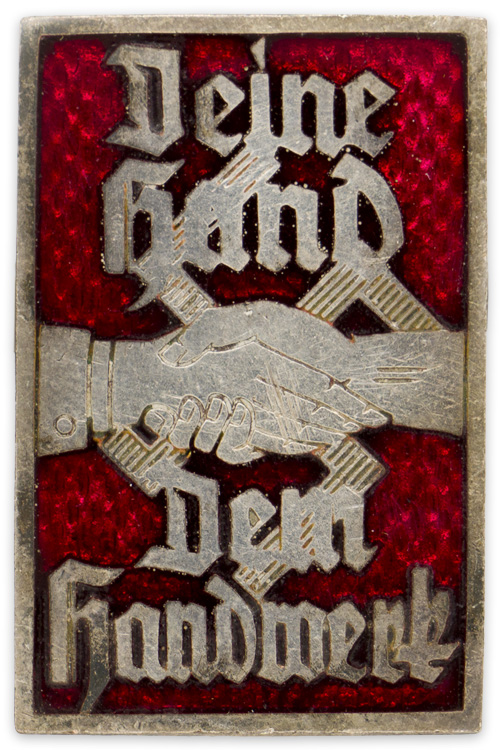 An alloy and enamel badge in the form of a vertical rectangle, 24mm wide and 36cm tall. The image to its obverse is of clasped hands before a mobile swastika, with "Deine Hand" (Your Hand) above and "Dem Handwerk" (To-the Handicrafts) beneath. The background is of patterned, translucent red enamel. A horizontal pin-back device is crimped to a circular plate to the reverse, underneath which is a maker’s logo.