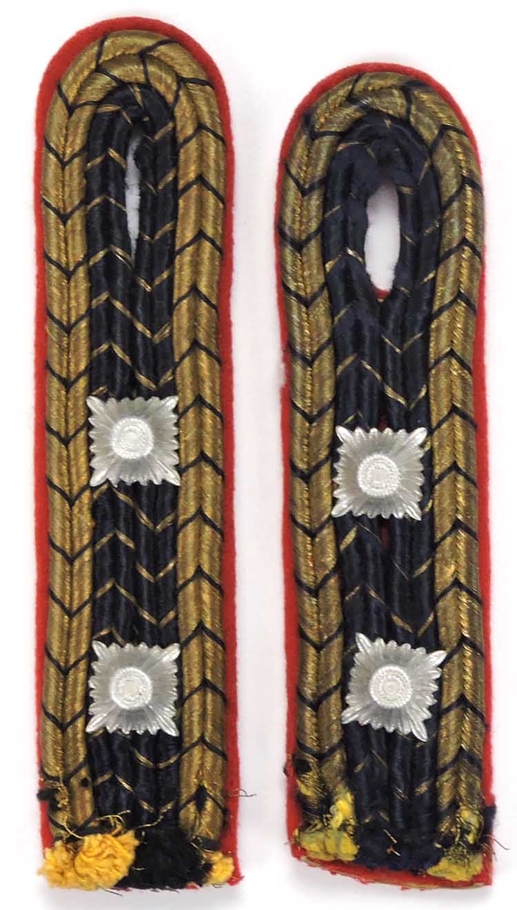 PHYSICAL DESCRIPTION: Sewn on shoulder boards. Underlay in red wool, and doubled cords to their surfaces, the outermost in gold with navy blue chevrons, and that to the inside in navy blue with gold chevrons. Double rank pips, represented pay groups 12.