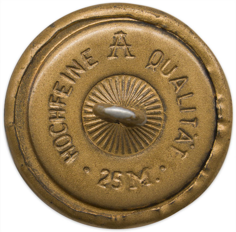 25mm diameter, uniform button, to whose convex obverse is embossed a spread-winged eagle with a wreathed, mobile swastika clutched in its talons. Maker marked.