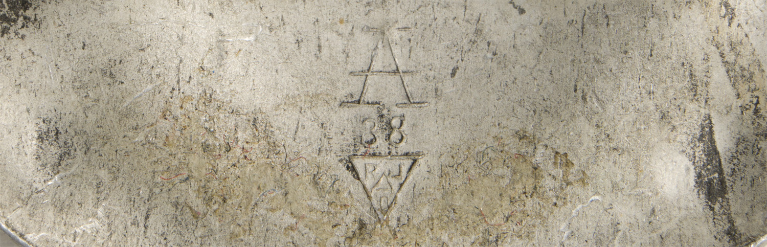 PHYSICAL DESCRIPTION: A finely detailed, 45mm wide and 35mm tall, horizontally oval, injection molded alloy brooch with a silver wash. The brooch features embossed stylized "rope" coils surrounding a central recessed, ribbed, circular field which encompassing an embossed, canted swastika flanked by embossed sheaths of wheat on a pebbled background field. Makers marked to Assmann.